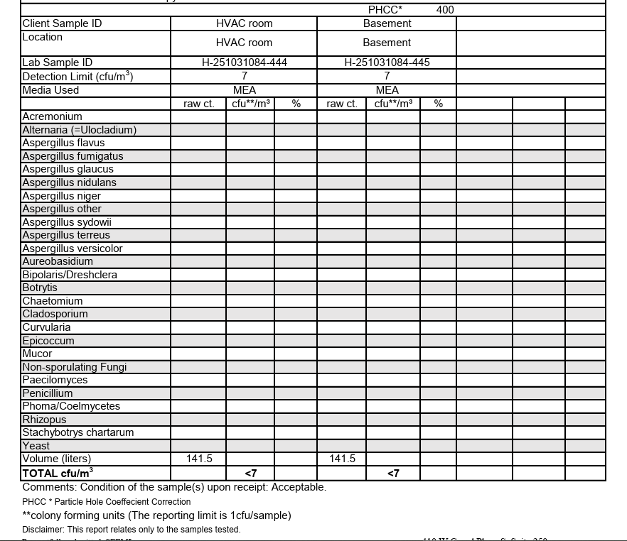 Our work began where the previous company left off — completing the demolition properly, removing all remaining affected material the right way, and then treating the entire home with our patented vapor technology. The vapor reaches porous materials throughout the building that demolition alone cannot address, eliminating the residual spore load driving her ongoing symptoms. Post-remediation air sampling confirmed 0 spores. The resident felt 100% back to normal. Five months later she remains completely symptom free.