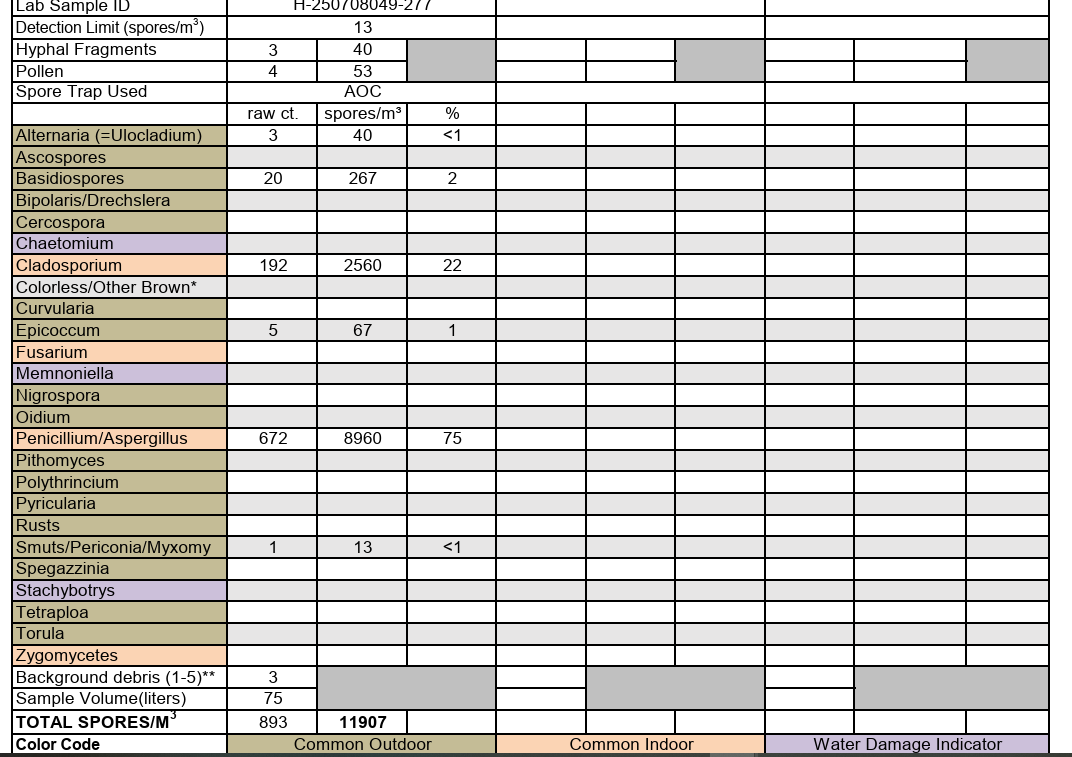 The closet was adjacent to a laundry room, and inspection revealed the dryer vent above the closet had detached. Instead of exhausting humid air outside, the vent had been pumping moisture directly into the enclosed space — creating the ideal conditions for mold to colonize the ceiling and coat nearby clothing and belongings with spores. Air sampling right next to the closet showed 11,907 spores per cubic meter, approximately seven to ten times higher than a normal indoor reading. Critically, the closet sat next to a return air vent, which meant the HVAC system had been pulling those spores and distributing them throughout the entire level of the home.
