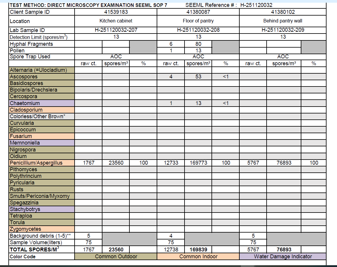 The condo owners noticed visible mold in their pantry and began experiencing respiratory symptoms. They hired a remediation company, but that company only removed a small, obvious section of affected material — leaving baseboard trim in place and the surrounding areas uninvestigated. When Pure Maintenance Wisconsin arrived, it was immediately clear the water damage likely extended well beyond the pantry and behind the adjacent kitchen cabinets. Air samples taken behind the cabinet wall confirmed high mold levels in that concealed space. An air sample of the interior living area revealed hundreds of thousands of spores per cubic meter in a single reading — far exceeding healthy limits. The residents had been breathing that air every day.
